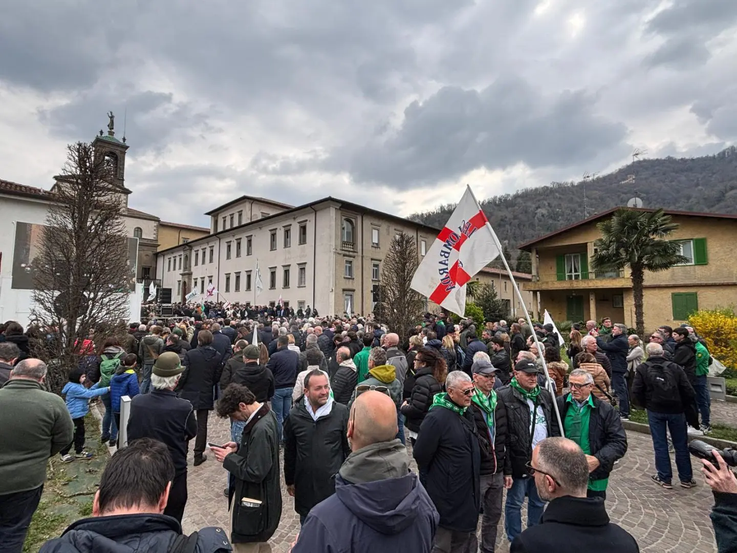 Sulla piazza allestito un maxischermo per assistere alla diretta della cerimonia. Tanti militanti, della prima ora, con il tipico fazzoletto verde della Lega, hanno salutato l’arrivo della premier con un applauso.