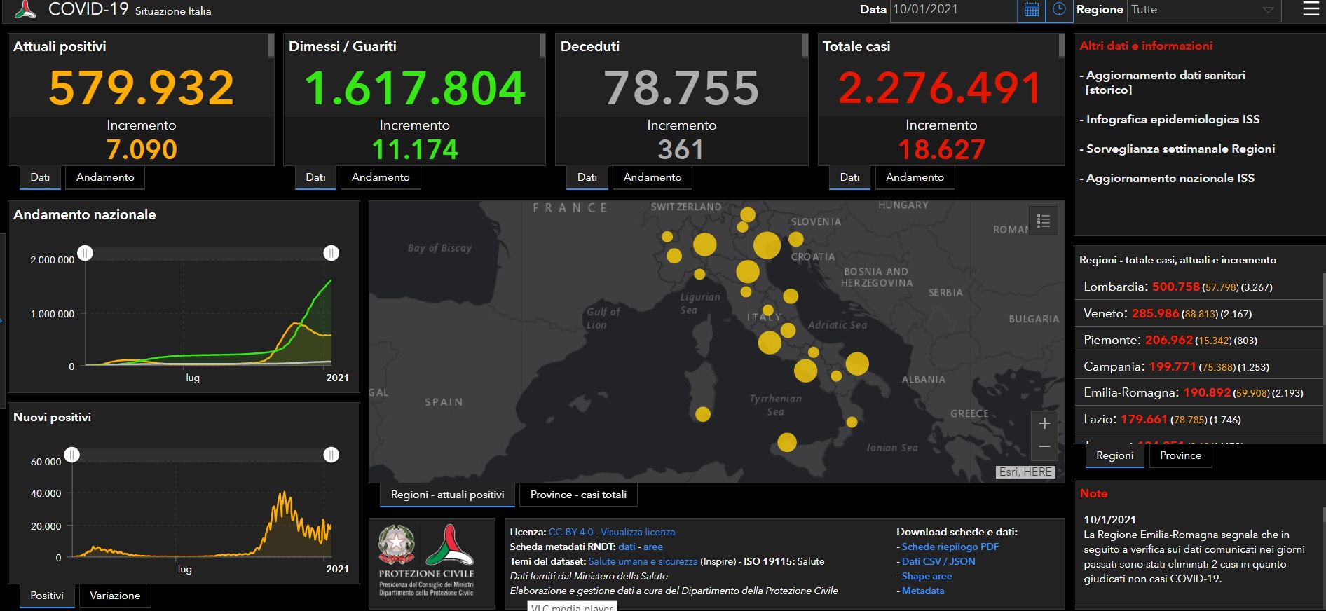 Nelle ultime 24 ore sono stati 361 i decessi per un totale di 78.755 vittime. Con quelli di oggi diventano 2.276.491 i casi totali di Covid in Italia. Attualmente i positivi sono 579.932 di cui 553.890 in isolamento domiciliare. I ricoverati in ospedale con sintomi sono 23.427 di cui 2.615 in terapia intensiva. I dimessi/guariti sono 1.617.804 con un incremento di 11.174 nelle ultime 24 ore.