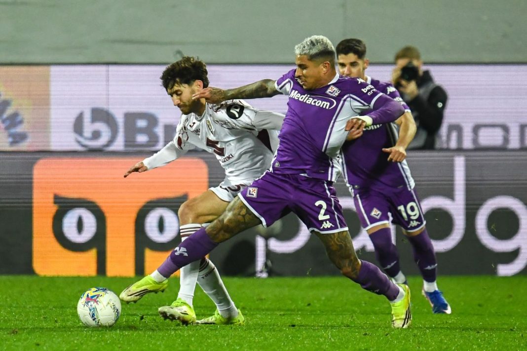 La partita è divertente ma ricca di errori, gli ospiti, seppur privi di Prati e Vlasi squalificati, dimostrano fin dai primi minuti di non essere venuti a Firenze in gita e collezionano due palle gol con Kulenovic e Lazaro, che sfiora la traversa. Il 3-5-2 mandato in campo da Baroni manda in tilt gli esterni gigliati, in particolar modo Dodo: non è un caso sia lui a perdere, in compartecipazione con Comuzzo, l’inserimento in area di Casadei, che servito da un assist di Ilkhan porta in vantaggio i granata al 26′. Segni viola nella parte iniziale di gara solo con un lancio per Kean che l’attaccante numero 20 spreca mettendo sopra la traversa solo davanti a Paleari. Proprio quest’ultimo è il protagonista fino all’intervallo con una parata di piedi su due colpi mancini di Brescianini e Mandragora. La Fiorentina sbatte troppe volte contro il muro ospite e alla fine Gudmundsson e compagni collezionano solo un alto numero di calci d’angolo.