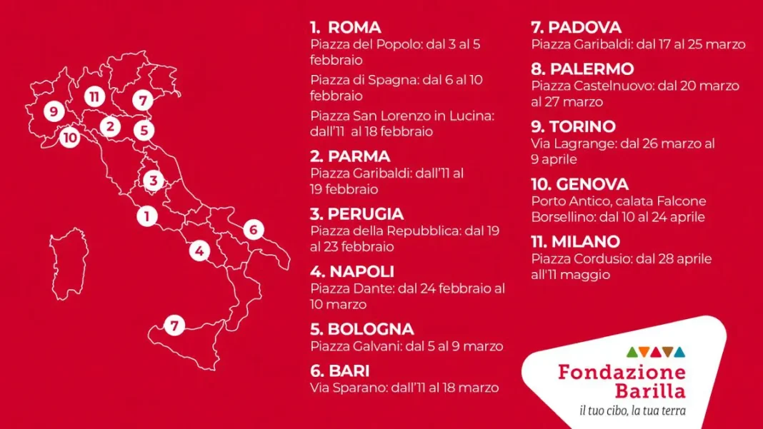 Roma – Piazza di Spagna: dal 6 al 10 febbraio; Roma – Piazza San Lorenzo in Lucina: dall’11 al 18 febbraio; Parma – Piazza Garibaldi: dall’11 al 19 febbraio; Perugia – Piazza della Repubblica: dal 19 al 23 febbraio; Napoli – Piazza Dante: dal 24 febbraio al 10 marzo; Bologna – Piazza Galvani: dal 5 al 9 marzo;