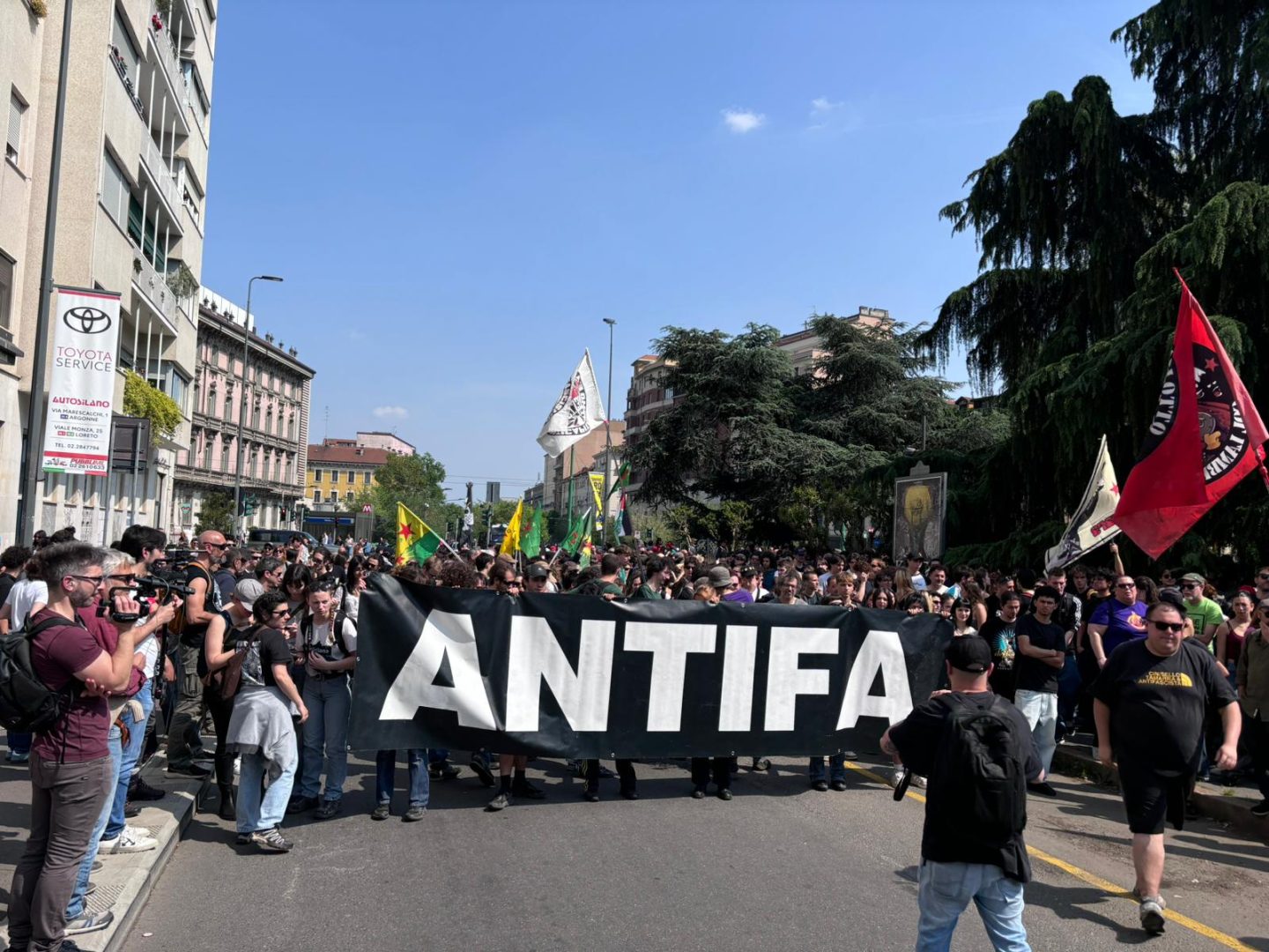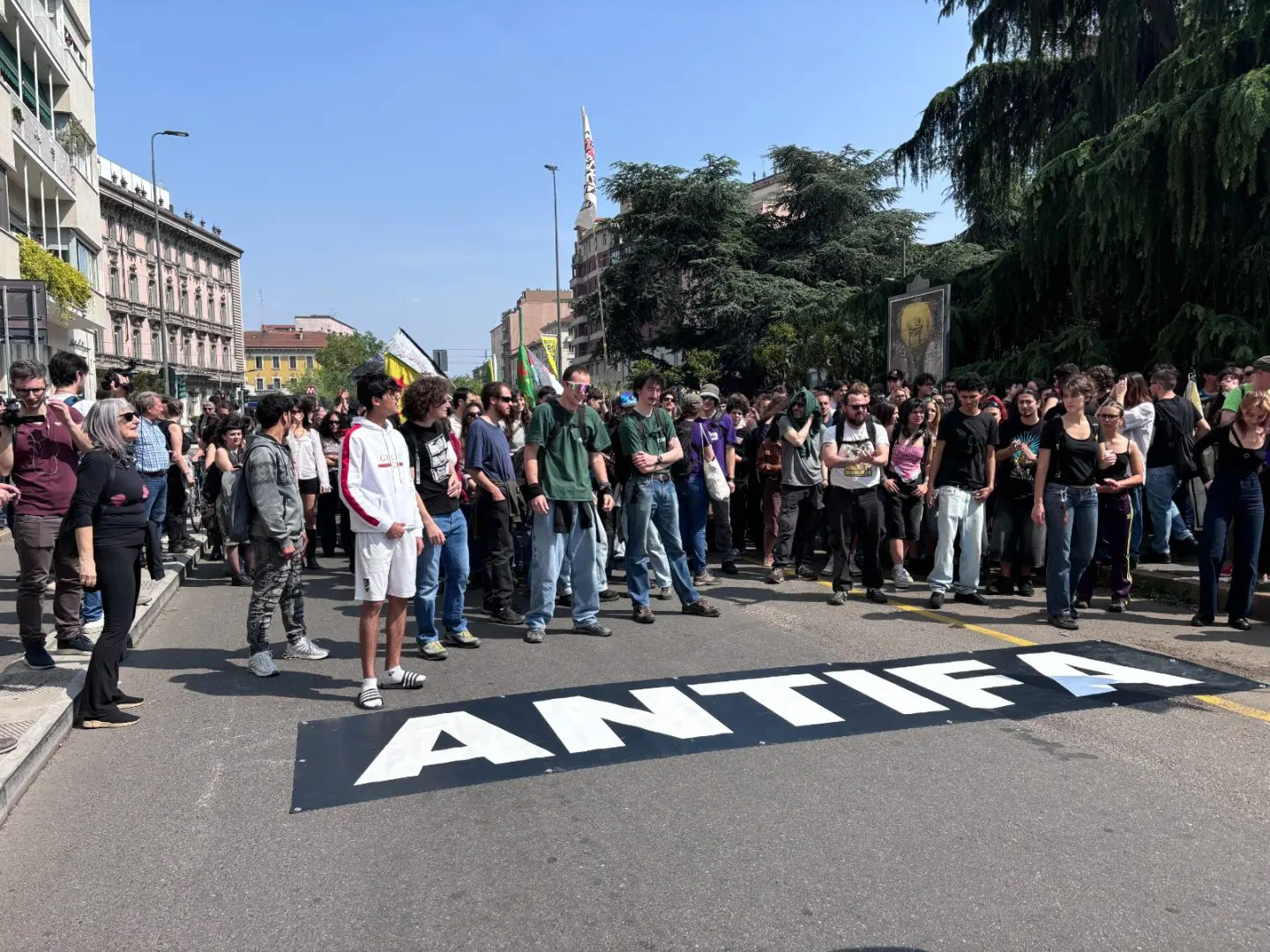Momenti di alta tensione quando il corteo dei centri sociali ha imboccato via Borgogna nel tentativo di raggiungere Piazza San Babila con l’intento di avvicinarsi più possibile al Duomo di Milano dove è incorso il raduno dei patrioti. L’accesso alla Piazza è bloccato dai blindati della polizia. Sono stati accesi fumogeni e lanciati petardi e bottiglie di vetro. La polizia ha risposto azionando gli idranti. Nella via l’aria si è fatta irrespirabile non appena il corteo è arretrato.