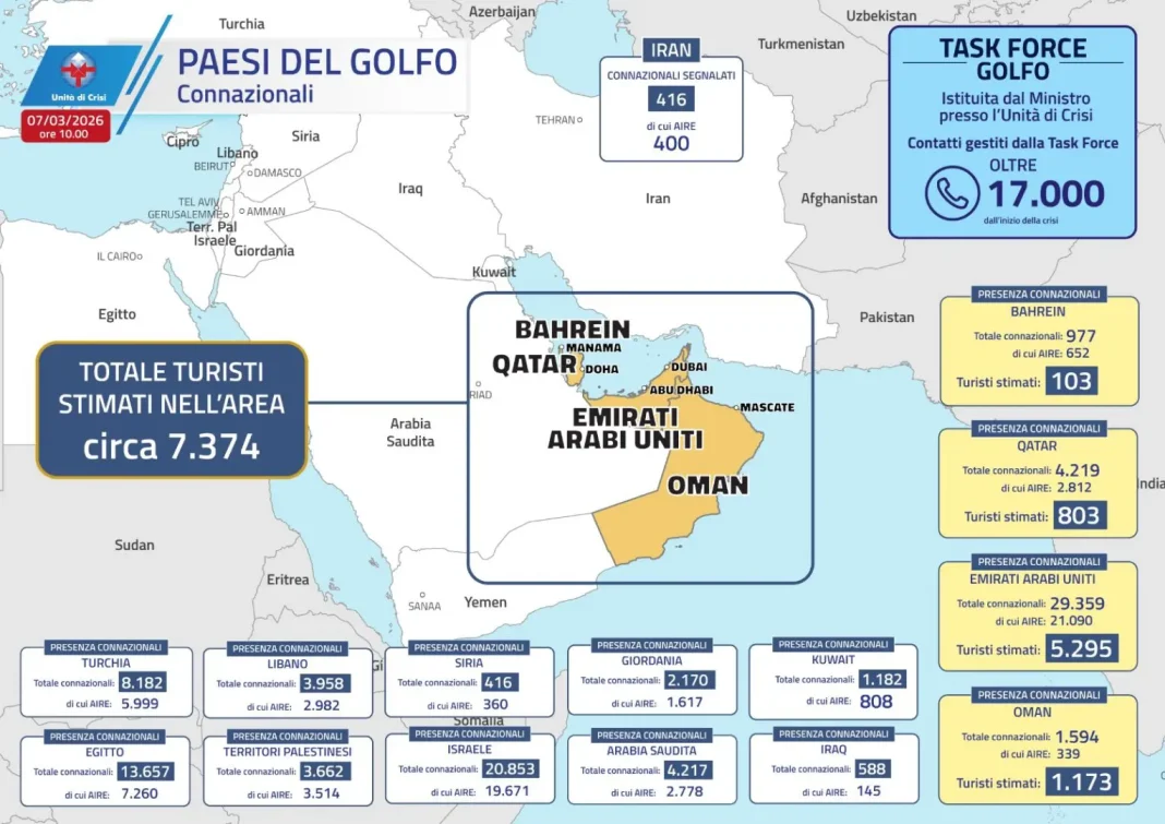 ROMA (ITALPRESS) – Sono scesi a 7.374 i turisti italiani ancora nei Paesi del Golfo, rispetto agli 8.200 dell’ultimo aggiornamento di ieri. Lo riferisce la Farnesina, spiegando che sono oltre 17.000 i contatti gestiti dalla Task Force Golfo dall’inizio della crisi. Il paese del Golfo con la maggiore presenza di connazionali sono gli Emirati Arabi Uniti, con 29.359 connazionali totali (21.090 AIRE) e 5.295 turisti stimati. Seguono Qatar, con 4.219 connazionali (2.812 AIRE) e 803 turisti; Oman, 1.594 connazionali (339 AIRE) e 1.173 turisti stimati; Bahrein, 977 connazionali (652 AIRE) e 103 turisti. Allargando lo sguardo all’intero Medio Oriente, la Farnesina segnala in Israele 20.853 italiani registrati, di cui 19.671 iscritti all’AIRE. Seguono Egitto, 13.657 connazionali (7.260 AIRE); Turchia, 8.182 connazionali (5.999 AIRE); Arabia Saudita, 4.217 connazionali (2.778 AIRE); Libano, 3.958 connazionali (2.982 AIRE); Territori Palestinesi, 3.662 connazionali (3.514 AIRE); Giordania, 2.170 connazionali (1.617 AIRE); Kuwait, 1.182 connazionali (808 AIRE); Iraq: 588 connazionali (145 AIRE), Iran, 416 connazionali (400 AIRE); Siria, 416 connazionali (360 AIRE).