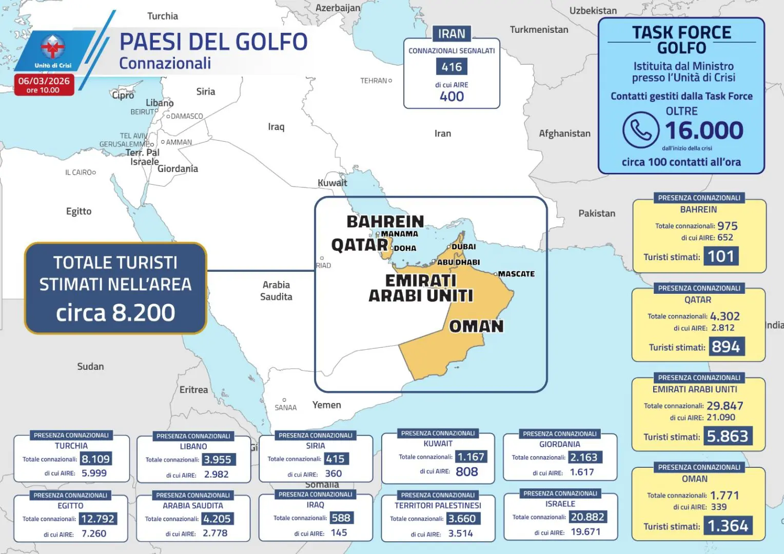 “Molti italiani si stanno spostando dalle Emirati in Oman perché l’aeroporto di Muscat è aperto. Abbiamo ottenuto l’autorizzazione ad un volo straordinario di ITA, e per accompagnare innanzitutto i più fragili, cioè malati e disabili, in più stiamo lavorando per portare in Arabia Saudita gli italiani che sono in Bahrain, in Qatar e in Kuwait”, ha aggiunto. “Avevamo già ridotto al massimo il personale a Teheran, ma abbiamo dovuto mettere in sicurezza tutti gli italiani che volevano partire. Ieri sera verso le 9 i tre convogli che erano partiti da Teheran hanno superato il confine con l’Azerbaigian, l’ultima a passare è stata la nostra ambasciatrice, ovviamente, perché la priorità è portare via gli italiani dalle zone di rischio. Quindi finché ci sono italiani a rischio, le ambasciate non chiudono”, ha sottolineato il ministro.